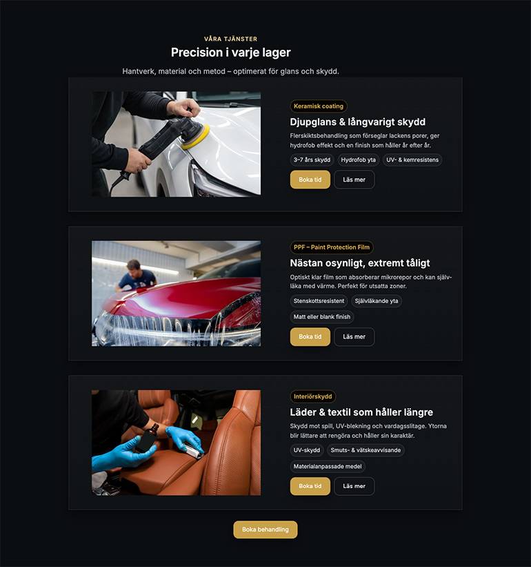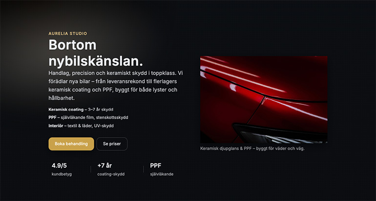 Vi skapade en konceptwebbplats för Oxira, specialister på lackbehandling för bilar. Designen lyfter fram både tjänsterna och expertisen, och gör det enkelt för kunder att boka tid eller ta kontakt.