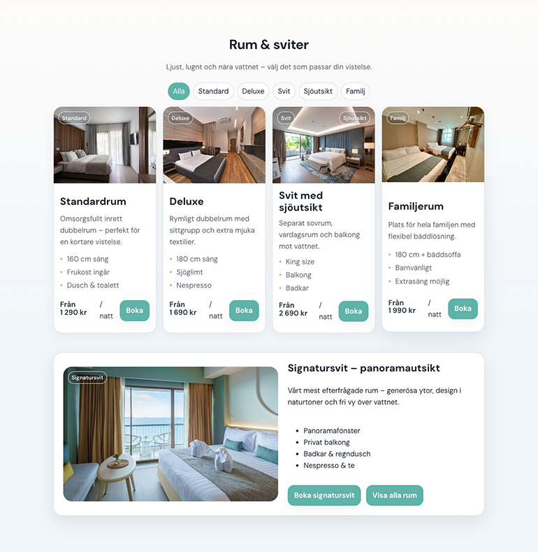 Vi skapade en hemsida för Hotell Sjöglimt – ett boutiquehotell vid vattnet. Fokus låg på att förmedla känslan av avkoppling och exklusivitet genom en modern design, inspirerande bilder och tydliga bokningsfunktioner.